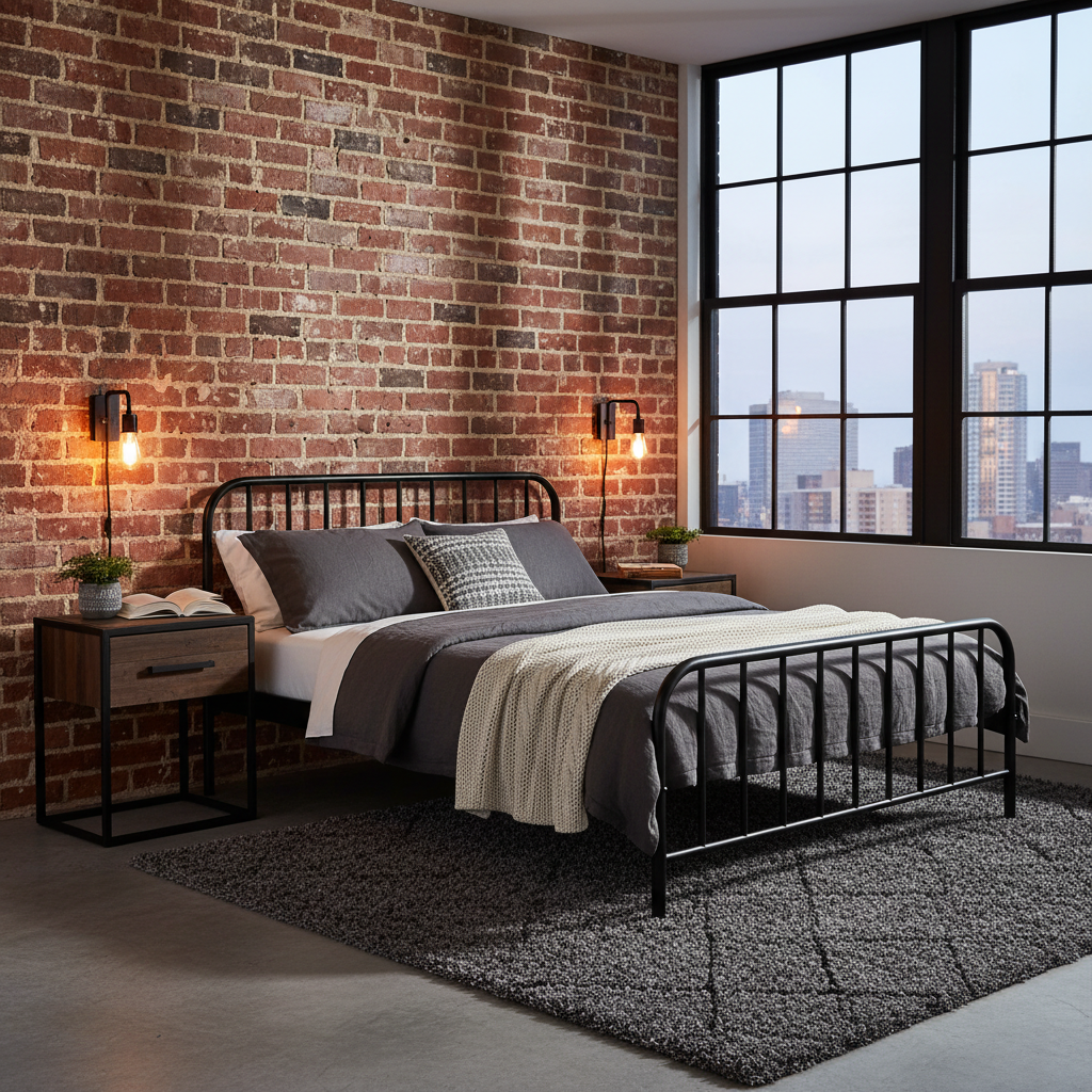 Key FurnitureMetallbett oder Holz mit Metallfüßen Nachttische aus Metall/Holz Kleiderschrank mit Gitterfront optional DekorBettwäsche in dunklen Tönen Grobe Strickdecken Grafische Prints Farben & MaterialienGraphit + Holz Leinenelemente für Weichheit Kein Hochglanz LichtMetall-Wandleuchten Schirmlose Pendel mit Filament Dimmer für Wärme