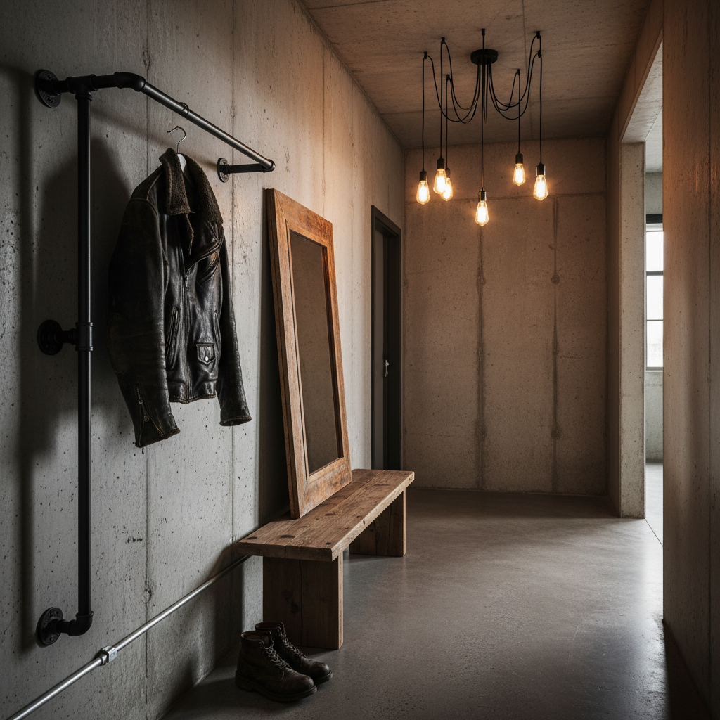 Flur / Eingangsbereich Raumidee Funktional mit Industrie-Anklängen: Metallhaken, robuste Bank.